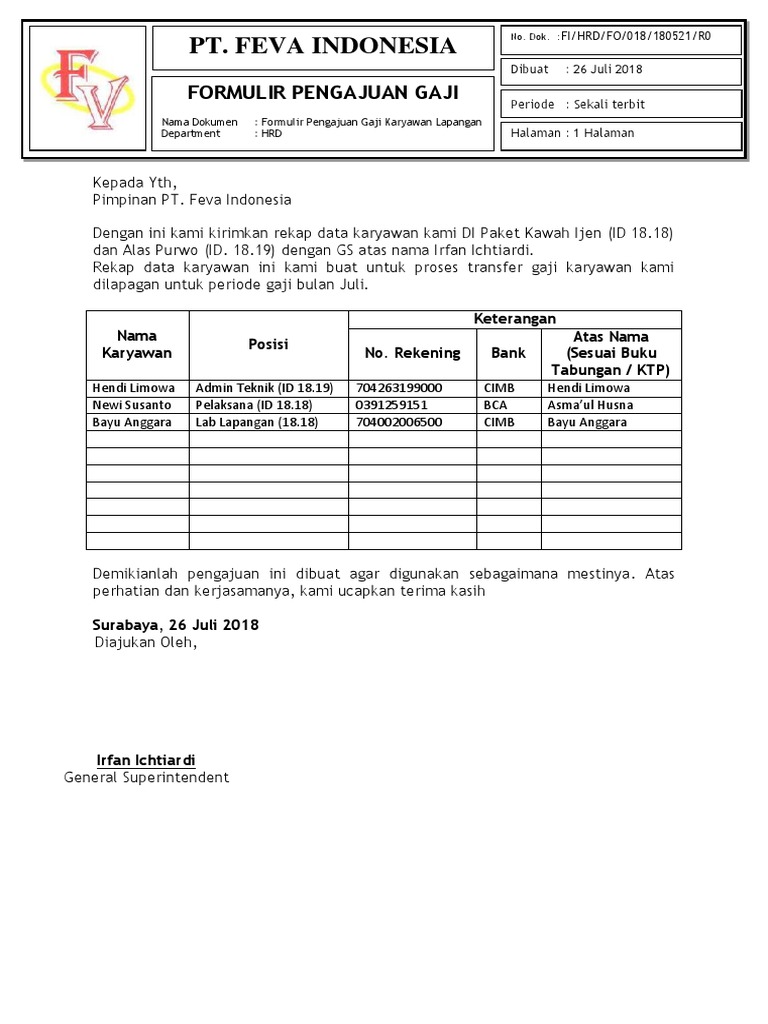 Form Pengajuan Gaji Karyawan - Contoh Redaksi Surat Permohonan Pemberhentian Pemotongan Gaji Pns Murad Maulana - Bahkan, ada karyawan yang harus meminta surat keterangan penghasilan ke bagian keuangan perusahaan sebagai syarat administrasi pengajuan kredit, hanya karena selama ini ia tidak pernah menerima slip gaji.. Oleh karena itu di dalamnya harus didukung oleh sumber daya manusia yang qualified dan profesional. Slip gaji ini diterbitkan oleh setiap perusahaan yang menggaji karyawan, baik dalam bentuk take home pay atau yang lainnya. Dalam rangka menentukan besaran gaji karyawan,. Silakan menunggu persetujuan dari atasan. Lowongan kerja jm group ( dept.store & supermarket ) kami perusahaan jm yang bergerak di bidang dept.store dan supermarket yang sedang berkembang,.