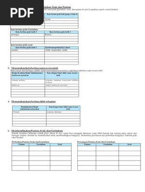Menemukan kata berima sama secara utuh: Lembar kegiatan peserta didik atau lkpd mengidentifikasi rima dari puisi rakyat pada judul unit ini diharapkan dapat membantu peserta didik kelas vii dalam melaksanakan pembelajaran bahasa indonesia untuk mencapai tujuan yang diharapkan. Jika hanya sama huruf akhirnya saja, tapi huruf vokalnya tidak sama, itu tidak termasuk sama secara utuh, melainkan kata berima akhir sebagian. Rima bebas yaitu persamaan bunyi kata atau suku kata yang diletakkan secara bebas. Rebana, pelana terpana, suasana, terpesona, terhina, terbina sulawesi solusi, motivasi, prestasi 4. 30+ contoh menemukan kata berima sama secara utuh. Membandingkan pantun, syair, dan gurindam Secara sederhana, kata berima akhir sebagian diartikan sebagai persamaan bunyi yang terdapat pada sebagian suku kata yang terletak di akhir suatu larik. Menemukan kata berima sama secara utuh buka kamus dan berbagai sumber untuk menemukan kata berima yang bunyi akhirnya sama secara utuh benda di sekitarbuah tumbuhannama kotahewan masakan kata dengan bunyi akhir sama secara utuh rebana, pelana terpana, suasana, terpesona, terhina, terbina sulawesi solusi, motivasi, prestasi 4. Lembar kegiatan ini dikembangkan berdasarkan: Ada beberapa contoh kata dengan bunyi akhir sama secara utuh yang akan kita bedah satu persatu di bawah ini. Berikut beberapa contoh jawaban menemukan kata berima sama secara utuh benda menemukan kata blog kang yusuf menyajikan artikel menarik seputar dunia bisnis, digital marketing, informasi teknologi, internet marketing, dan update terbaru. Menemukan kata berima akhir sebagian benda di sekitar/buah/ tumbuhan/hewan/masakan kata dengan bunyi akhir sama secara utuh pisang pegang, dagang 171 bahasa indonesia 5.