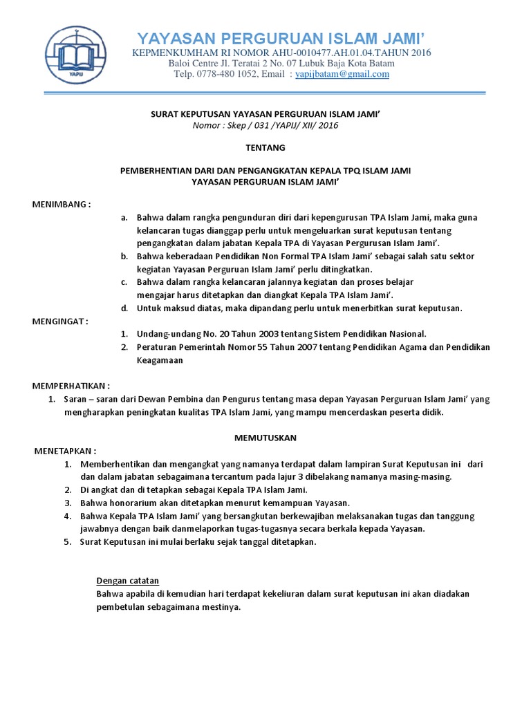 Permohonan tertulis ditujukan kepada kepala kantor kementerian agama kab. Surat keputusan yayasan tentang pendirian penyelenggaraan tkq/tpq/tqa, dan rekomendasi dari kua kecamatan. Berdasarkan penilaian kami terhadap kinerja saudara ari sulistyo dari masa percobaan mulai bekerja hingga masa. Tahun pelajaran 20172018 ketua yayasan dharma wanita kudi. Surat keputusan pengurus masjid jannatul firdaus.