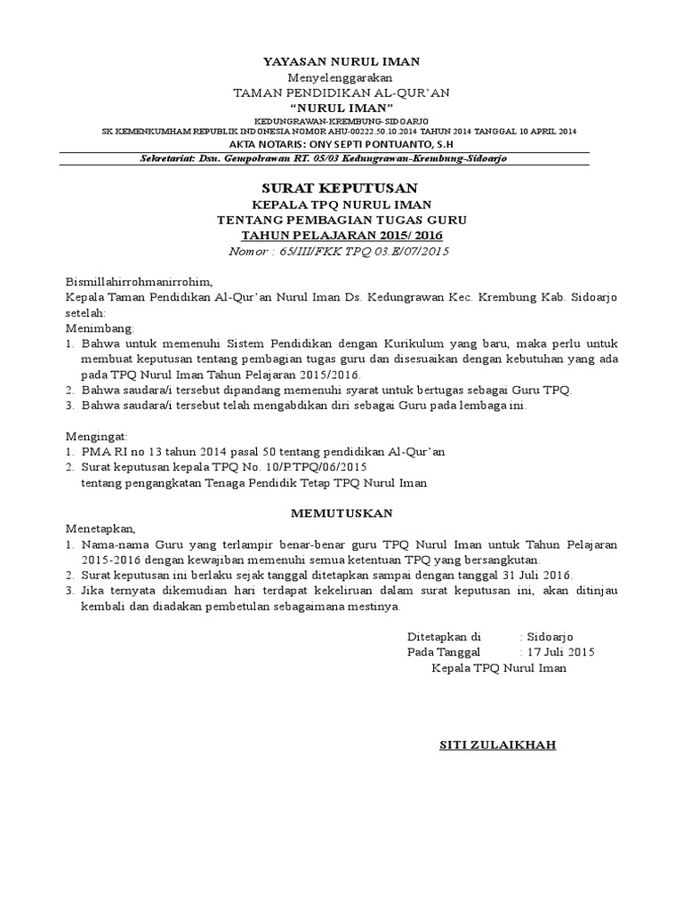 Contoh sk mengajar paud dari yayasan guru ilmu sosial contoh sk pengangkatan kepala sekolah madrasah swasta doc yayasan pendidikan nama yayasan alamat yayasan surat keputusan nomor course hero. 18042020 dalam contoh sk bendahara tpq dari yayasan ini bisa disesuaikan dengan kondisi lembaga apakah berada dibawah naungan takmir masjid remaja masjid pengajian ibu ibu organisasi masyarakat atau yayasan itu sendiri. Keabsahan pengangkatan kepala tpq ini dibuktikan dengan adanya sk yang menunjuk seseorang untuk ditugaskan sebagai kepala pada lembaga. Surat keputusan yayasan tentang pendirian penyelenggaraan tkq/tpq/tqa. Contoh sk yayasan pengangkatan kepala sekolah sinter g.